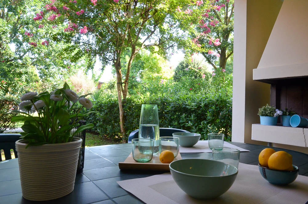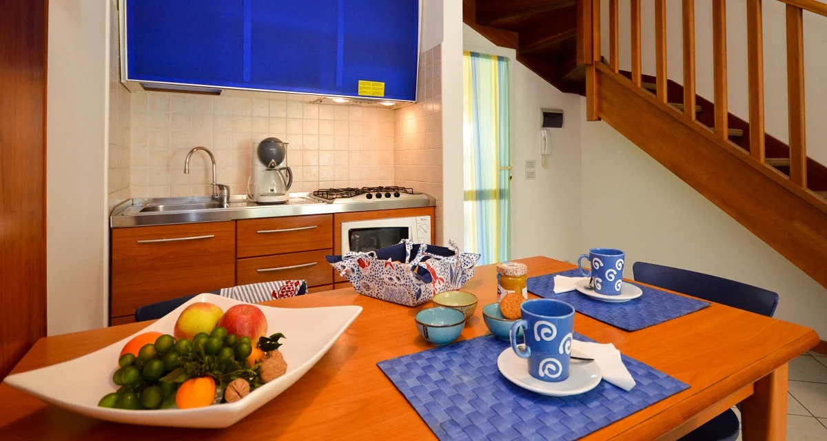 TRILOCALE con 5-7 posti letto, disposto su 2 piani, composto da: piano terra: soggiorno con divano letto doppio, angolo cottura, bagno, portico con caminetto o barbecue, giardinetto privato; 1° piano: 1 camera con 1 letto matrimoniale e 1 letto singolo, 1 camera con 2 letti singoli, terrazzo, bagno. Posto auto sotto il pergolato posto di fronte allingresso della villetta.