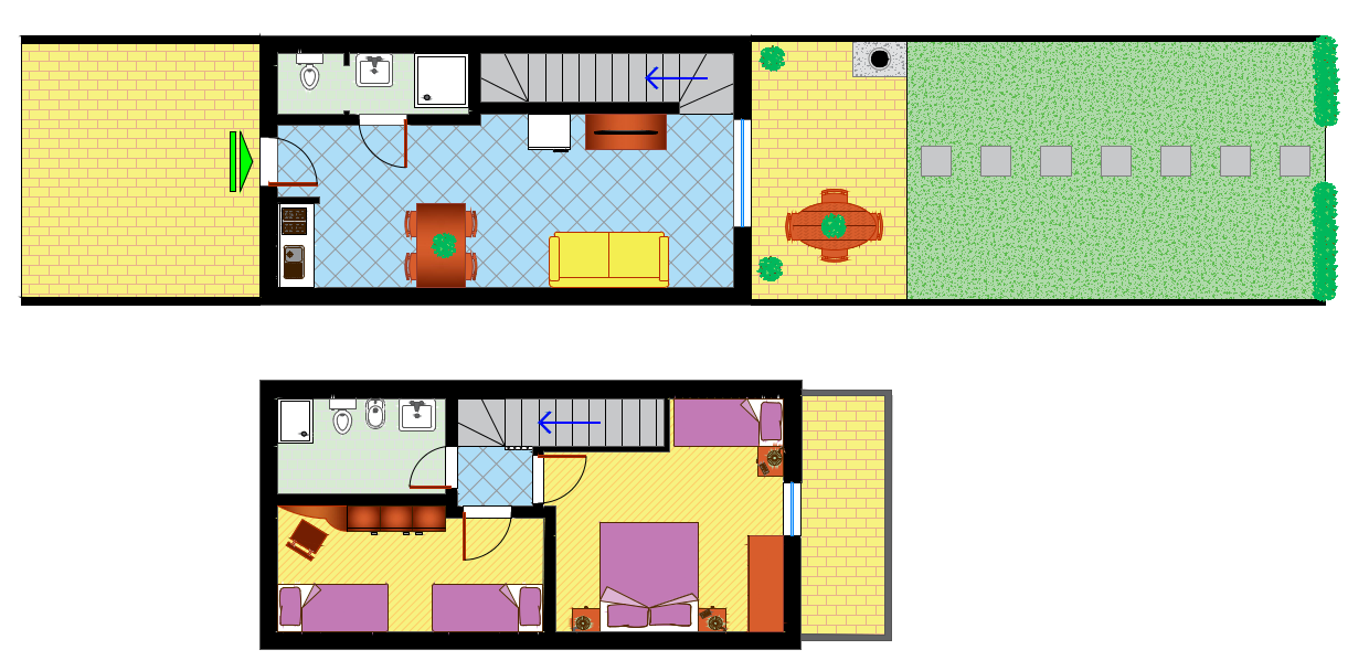 HÁROM LÉGTERŰ 5-7 fő részére, 2 szinten; a földszinten: nappali kétszemélyes kanapéval, főzősarok, fürdőszoba, veranda kandallóval vagy grillezővel, saját kert; az 1. emeleten: 1 szoba franciaággyal és 1 egyszemélyes ággyal, 1 kétágyas szoba, erkély, fürdőszoba. Parkolóhely a garázsban. A második szobában az ágyak esetlegesen részben fedhetik egymást.